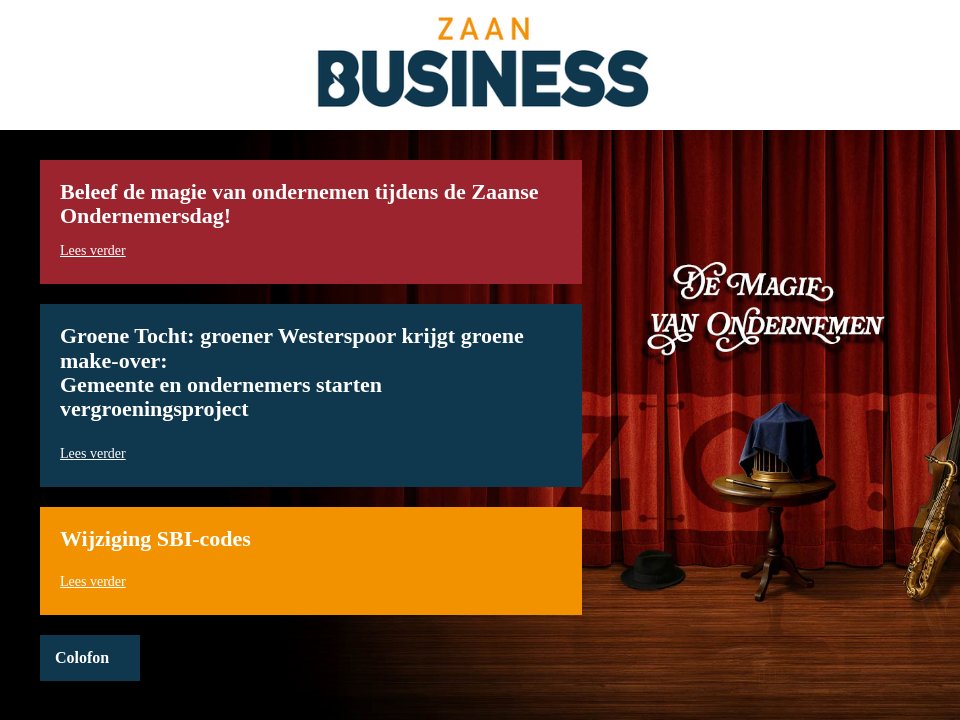 In deze editie: Beleef de magie van ondernemen tijdens de Zaanse Ondernemersdag! Lees verder Groene Tocht: groener Westerspoor krijgt groene make-over: Gemeente en ondernemers starten vergroeningsproject Lees verder Wijziging SBI-codes Lees verder Colofon