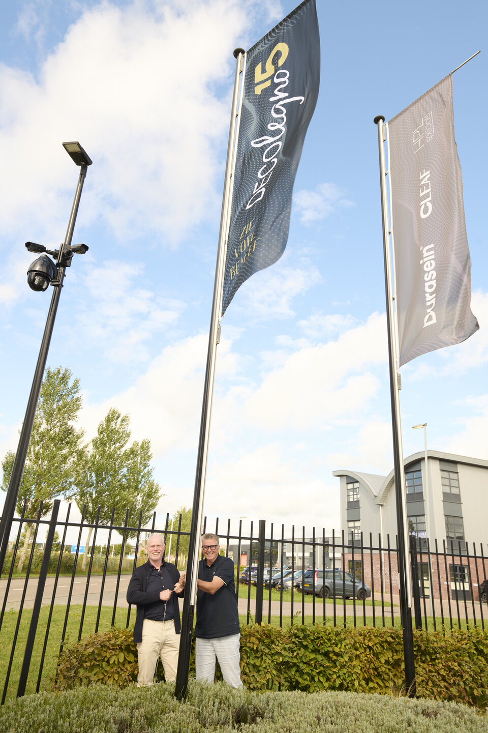 Patrick Leering en Guido Hofman van DecoLegno hijsen de jubileum vlag